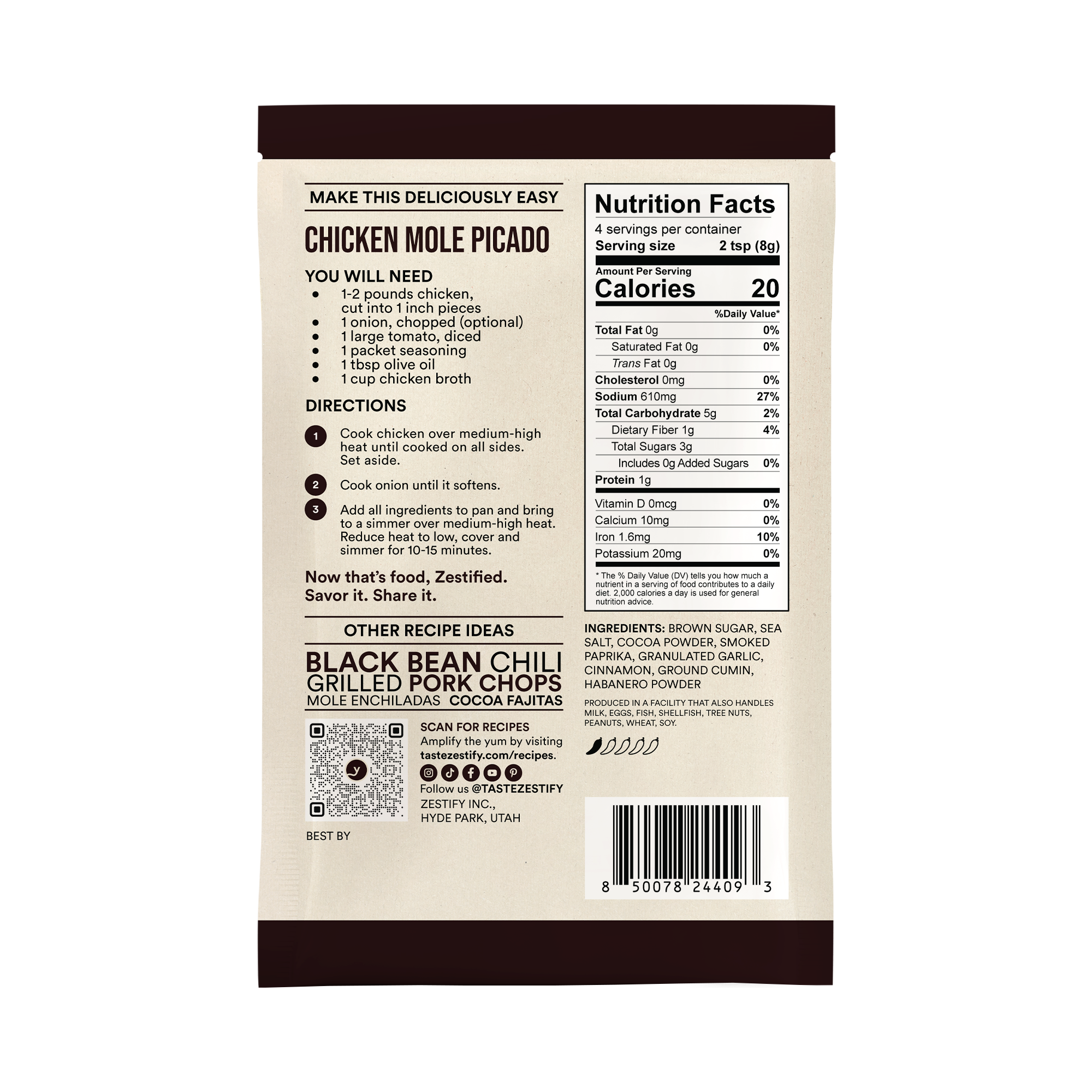 Brown sugar, sea salt, cocoa powder, smoked paprika, granulated garlic, cinnamon, ground cumin, habanero powder