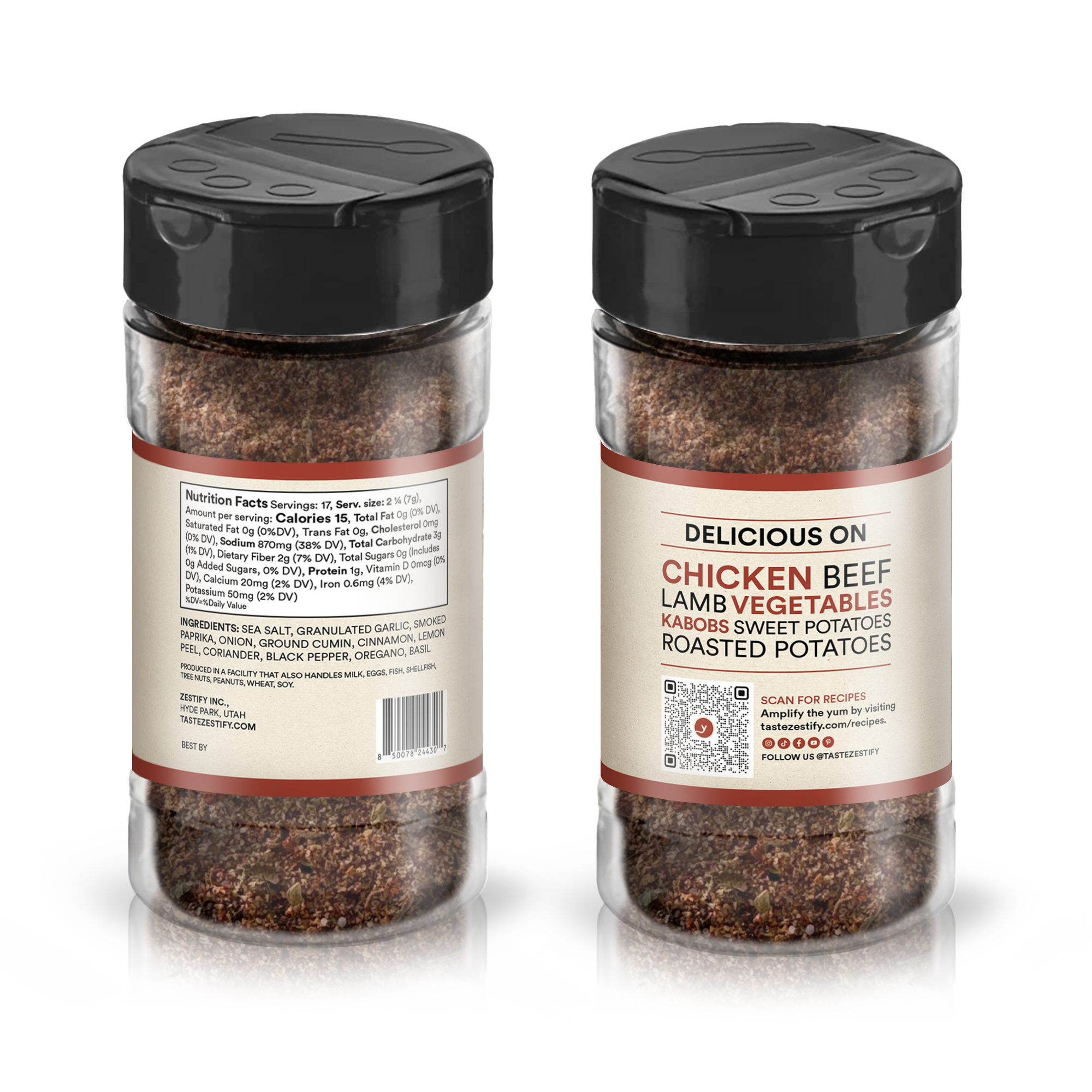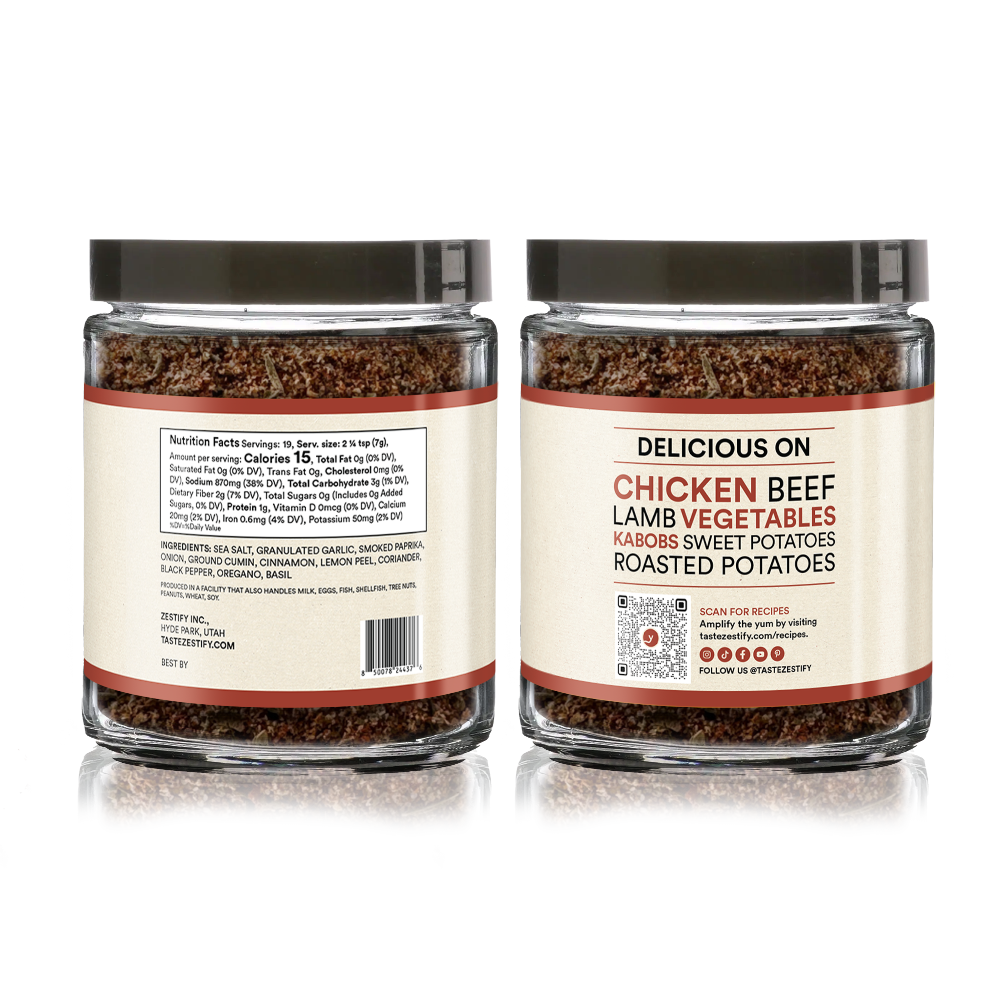 Sea salt, granulated garlic, smoked paprika, onion, ground cumin, cinnamon, lemon peel, coriander, black pepper, oregano, basil